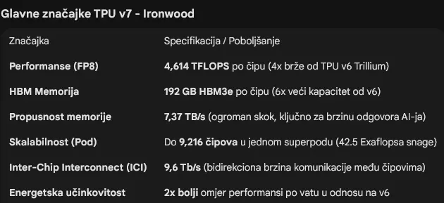 Ironwood, koji omogućuje treniranje i pokretanje modela s bilijun parametara bez trenja u prijenosu podataka, predstavlja značajnu, na tržištu prepoznatu oštricu.