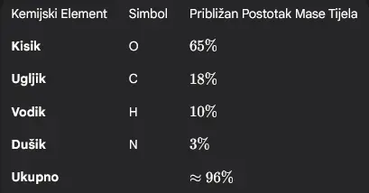 Napomena: Preostalih ≈4% mase tijela čine elementi poput kalcija, fosfora, kalija, sumpora, natrija, klora i magnezija, te elementi u tragovima | Tablica: Gemini AI | Prompt: Grabancijaš
