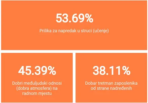 Najveći broj ispitanika (53%) kao najvažniji kriterij naveo je mogućnosti za profesionalni razvoj. Slijede kvalitetni međuljudski odnosi, koje je istaknulo 45% sudionika, dok je dobar odnos nadređenih prema zaposlenicima zauzeo treće mjesto s 38% glasova.