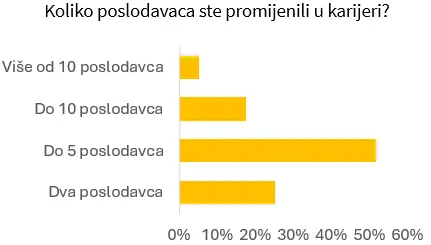 Kad je riječ o ukupnom broju poslodavaca koje smo imali tijekom dosadašnje karijere, najveći broj ljudi (52%) dosad je promijenio tri do pet poslodavaca, dok je četvrtina (25%) zaposlenih promijenila dva posla. Gotovo petina radnika (18%) je imala između 5 i 10 poslodavaca, a 5% se okušalo u više od deset različitih radnih okruženja.