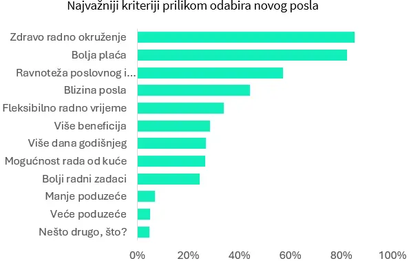 Pri odabiru novog poslodavca, ispitanicima su najvažniji kriteriji zdravo i podržavajuće radno okruženje (85%) te konkurentna plaća (82%). Više od polovice ljudi ističe kako im je ključna ravnoteža između poslovnog i privatnog života, dok značajan broj njih pridaje važnost i blizini radnog mjesta (44%) te fleksibilnom radnom vremenu (34%).