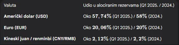Prema podacima koji se odnose na prvi kvartal 2025. godine (2025Q1) i izvješću ECB-a za 2024. godinu, udjeli triju valuta u alociranim globalnim deviznim rezervama (ne uključujući zlato i neraspoređene rezerve) su približno sljedeći: