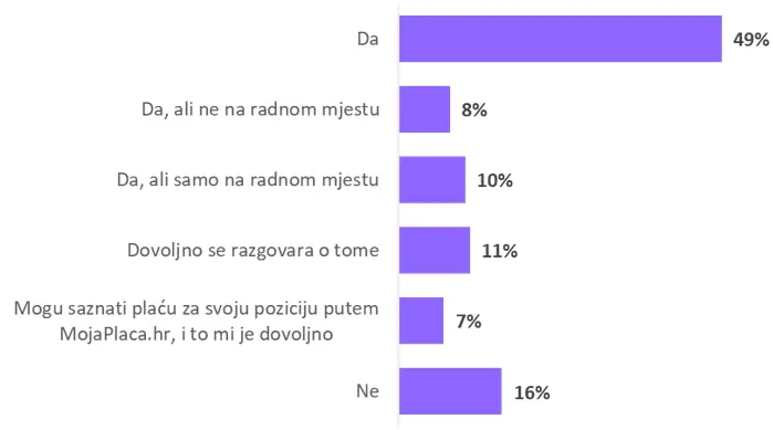 S druge strane, svega 16% ispitanika ne želi da razgovori o plaćama postanu norma. Još manji udio, njih 7%, uopće nema potrebu raspravljati o toj temi, dovoljan im je uvid u podatke dostupne putem servisa MojaPlaća.