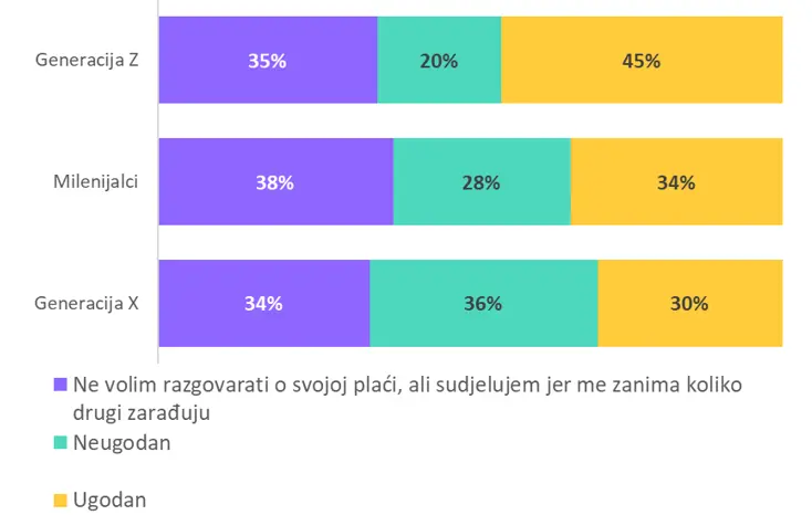 Generacijske razlike dodatno naglašavaju ovaj jaz: pripadnici generacije Z razgovor o plaći uglavnom doživljavaju pozitivno, a tek petina ih priznaje da im je ta tema neugodna. S druge strane, najviše nelagode bilježi se među pripadnicima generacije X.