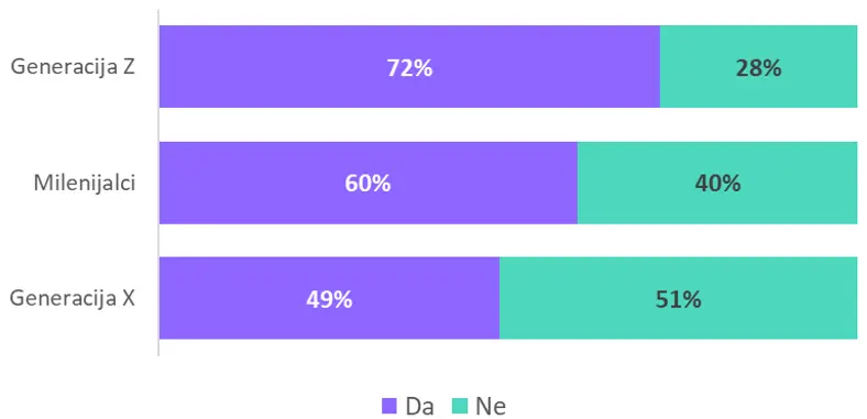 No, generacijska slika otkriva zanimljive razlike. Najotvoreniji su pripadnici generacije Z, pa tako gotovo tri četvrtine(72%) pripadnika te generacije bez zadrške progovara o primanjima. Slijede ih milenijalci, među kojima 60% razgovara o plaći, dok su najzatvoreniji pripadnici generacije X, gdje to čini tek svaki drugi (49%).