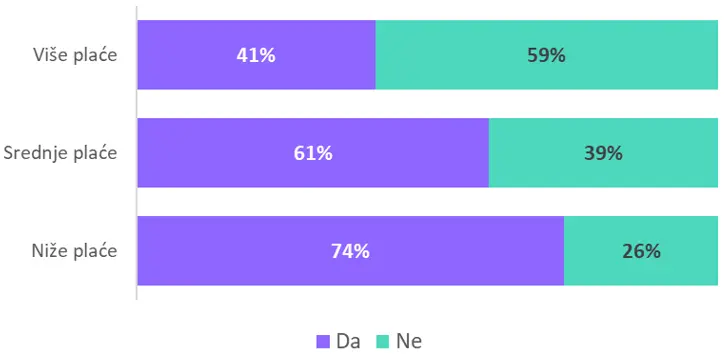 Nije iznenađenje da o plaći najčešće govore oni kojima je to osjetljiva tema, čak 74% zaposlenih s nižim primanjima otvoreno razgovara o svojoj zaradi. S druge strane, među onima s višim plaćama takvi su razgovori znatno rjeđi, prisutni kod tek 41% ispitanika.