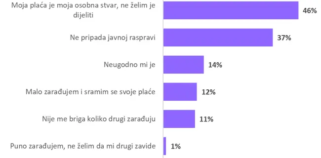 Među ispitanicima koji ne razgovaraju o plaći, najviše ih smatra da je visina njihove plaće isključivo osobna stvar, 37% ih tvrdi kako plaće općenito nisu tema za javnu raspravu.