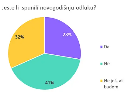 Na pitanje jesu li ispunili svoju prošlogodišnju odluku, 41% ispitanika odgovara da nije, dok ih 32% priznaje da još nisu, ali se nadaju da bi to mogli u budućnosti. Tek 28% ispitanika u potpunosti je ostvarilo svoju novogodišnju odluku.