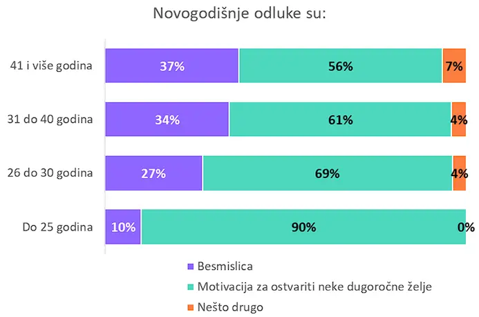 Novogodišnje odluke besmislenima češće smatraju muškarci (40%) nego žene (32%), kao i stariji ispitanici. Među mlađima prevladava optimizam i tek svaki deseti ispitanik mlađi od 25 godina smatra novogodišnje odluke nepotrebnima.