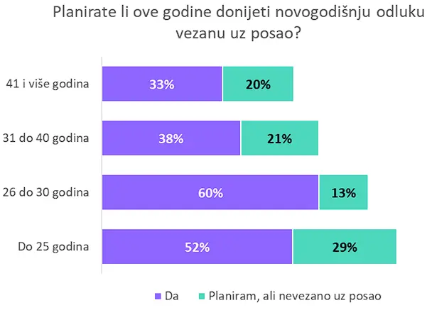 Najčešće su to mlađi ispitanici pa tako odluku vezanu uz posao planira donijeti 60% ispitanika u dobi od 26 do 30 godina, kao i 52% mlađih od 25 godina. U skupini od 31 do 40 godina takvu odluku planira 38% ispitanika, dok je među starijima od 41 godine taj udio znatno manji i iznosi 33%.