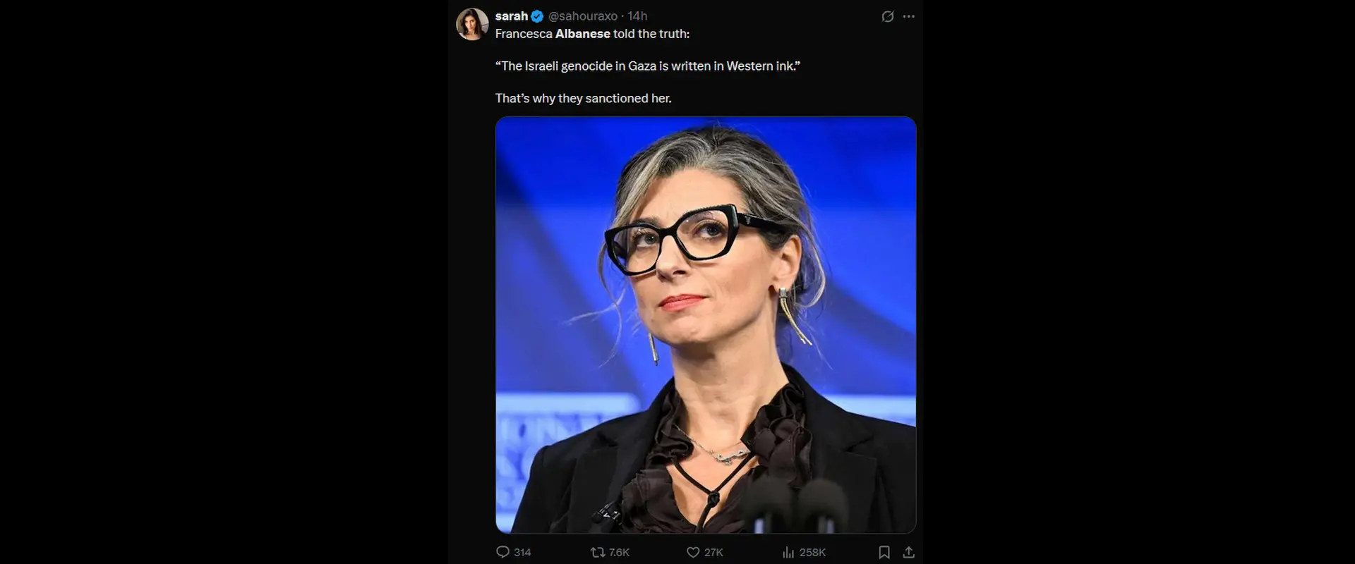 “🚨 PRIJELOMNA VIJEST: SAD su upravo sankcionirale dužnosnicu UN-a Francescu Albanese – LAŽNU odvjetnicu koja je godinama širila propagandu Hamasa i blatila jedinu židovsku državu na svijetu. Tvoja karijera lobistkinje Hamasa ima svoju cijenu, Francesca. Sada račun dospijeva na naplatu,” osudio je s druge strane i uz pomno okinut “screenshot” jedan od otvoreno cionističkih računa s nazivom “Židovi uzvraćaju udarac”.