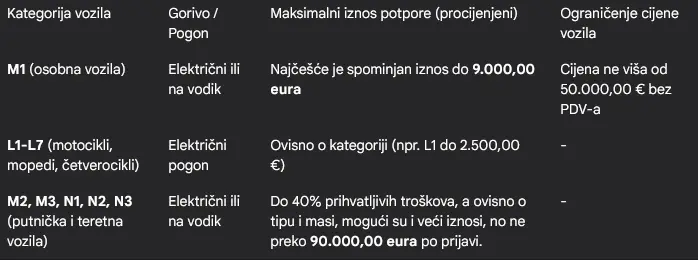 Prihvatljiva su bila isključivo nova vozila na električni pogon ili pogon na vodik. Poziv je privremeno zatvoren 20. listopada 2025. godine zbog velikog broja zaprimljenih prijava.