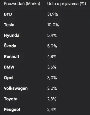 Gledano po markama iz podnesenih prijava, najzastupljeniji su zahtjevi za sljedeće proizvođače: BYD (31,9% ), Tesla (10%), Hyundai (5,4% ), Škoda (5%), Renault (4,8%), BMW (3,6% ), Opel i Volkswagen (3% ), Toyota (2,8% ) i Peugeot (2,4%).