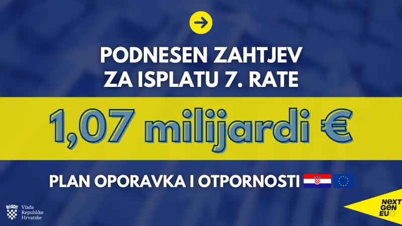 Hrvatska je danas Europskoj komisiji uputila sedmi zahtjev za isplatu sredstava iz Mehanizma za oporavak i otpornost, temeljen na uspješnom ispunjenju sva 53 reformska i investicijska pokazatelja iz Plana oporavka i otpornosti. Vrijednost zahtjeva iznosi milijardu i 70 milijuna eura, što ga čini najvećom pojedinačnom tranšom iz europskog proračuna u korist Hrvatske od ulaska u EU.