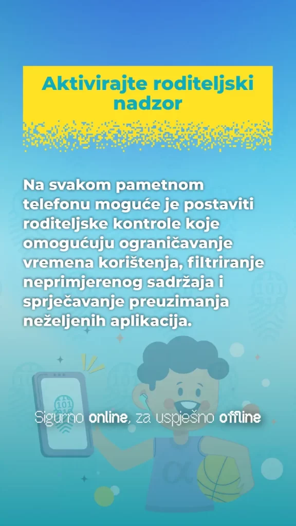 • Aktivirajte roditeljski nadzor: Na svakom pametnom telefonu moguće je postaviti roditeljske kontrole koje omogućuju ograničavanje vremena korištenja, filtriranje neprimjerenog sadržaja i sprječavanje preuzimanja neželjenih aplikacija.