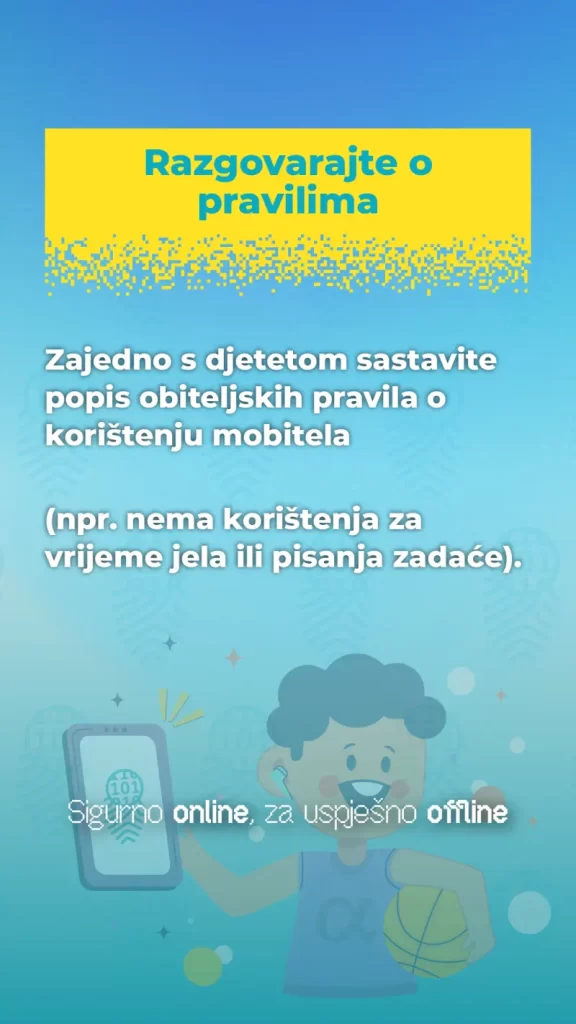 • Razgovarajte o pravilima: Zajedno s djetetom sastavite popis obiteljskih pravila o korištenju mobitela (npr. nema korištenja za vrijeme jela ili pisanja zadaće).