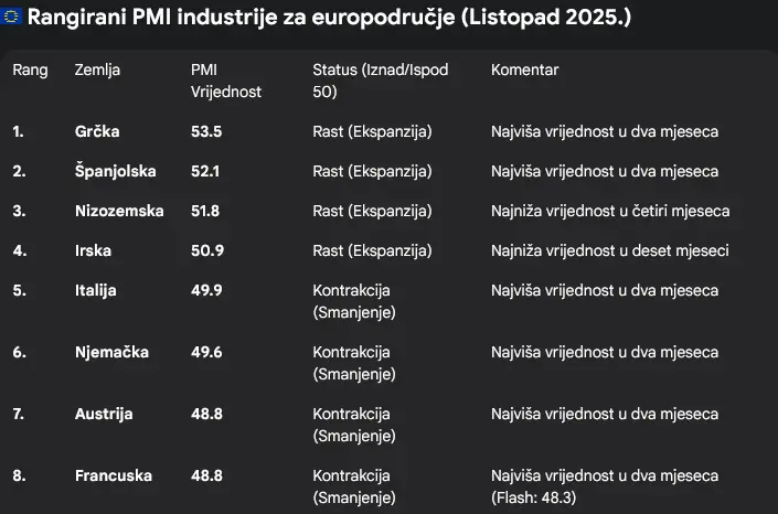 Konačni proizvodni Indeks menadžera nabave (PMI) koji za S&P Global propituje Hamburška komercijalna banka (HCOB) u listopadu je određen na 50, odnosno na granicu koja razdvaja sažimanje od širenja.