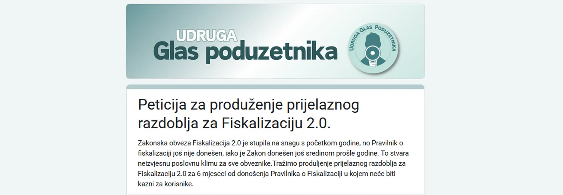 Udruga Glas poduzetnika (UGP) u priopćenju poziva Vladu Republike Hrvatske da uvede prijelazno razdoblje prilagodbe za Fiskalizaciju 2.0 u trajanju od najmanje šest mjeseci, tijekom kojeg se ne bi izricale kazne poduzetnicima.