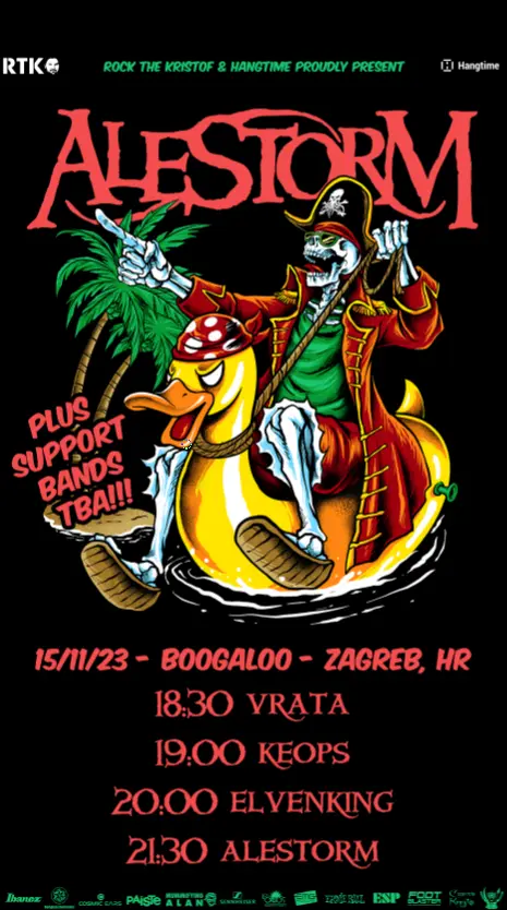 Sve je spremno za dugoiščekivanu metal feštu koja se sprema ovu srijedu (15.11.) u Boogaloou. Jedan od najveselijih bendova ovog žanra, Alestorm, vraća se u Zagreb, a njima će se pridružiti Talijani Elvenking i domaći momci Keops. Večer će zaokružiti neprikosnoveni DJ Barby koji sa sobom nosi oveći naramak prigodnih metal hitova. Cijena ulaznica u pretprodaji je 33 eura i mogu se kupiti u Dirty Old Shopu ili online preko sustava Entrio. Na dan koncerta, ako ih ostane, koštat će 37 eura. Iz organizacije poručuju da ih je ostalo još manje od 15%.